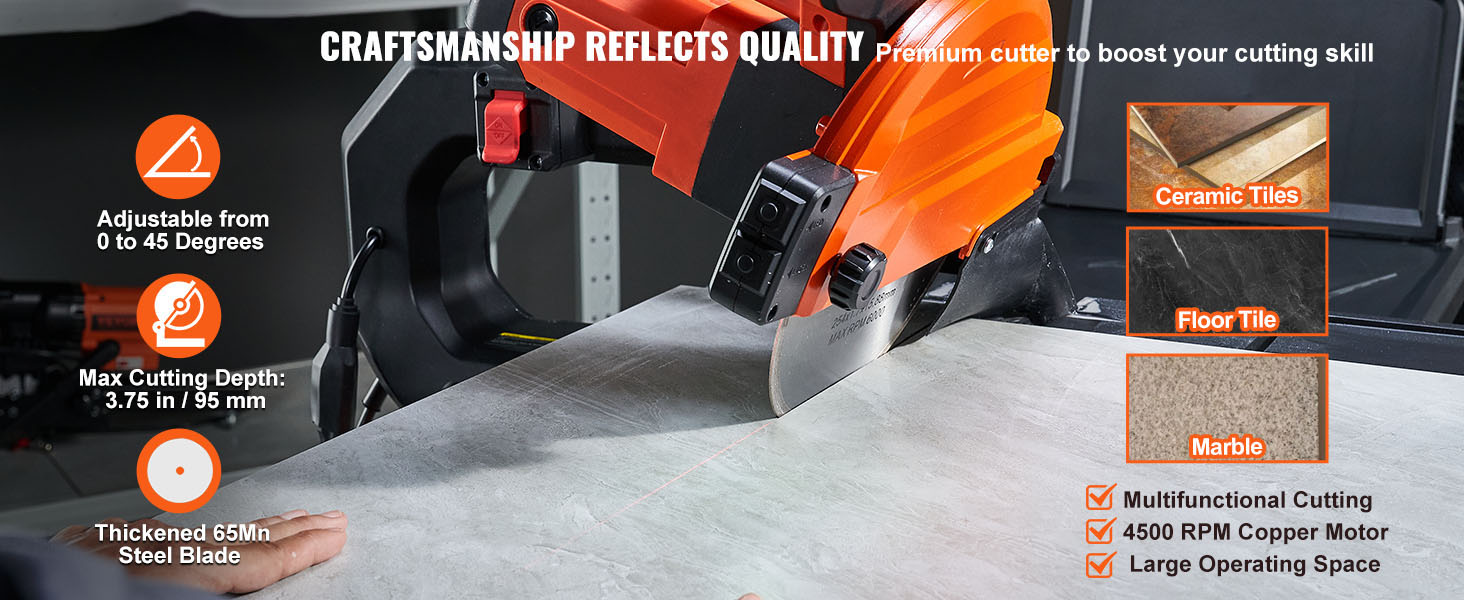 - 0-45° Angle and Deep Cutting: The wet tile saw provides adjustable cutting angles from 0 to 45 degrees (with markings at 0°/22.5°/45° positions). The maximum cutting depth is 3.75 in / 95 mm and the maximum tile size is 36 in / 914 mm. Equipped with a thick 65Mn steel blade and a high-speed 4500 RPM induction motor, it can effortlessly cut various ceramic tiles, floor tiles, and stones.